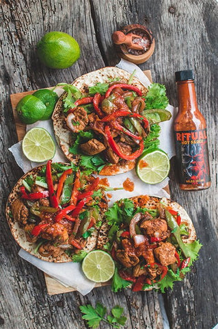 Cook the chicken breast in a hot pan with some olive oil. Let it brown on all sides and then add the peppers and onions. Season with black pepper and soy sauce and cook for another 3 minutes. When it’s ready, serve on the tortilla with some fresh salad and top it up with Hellfire Ritual Hot Sauce.